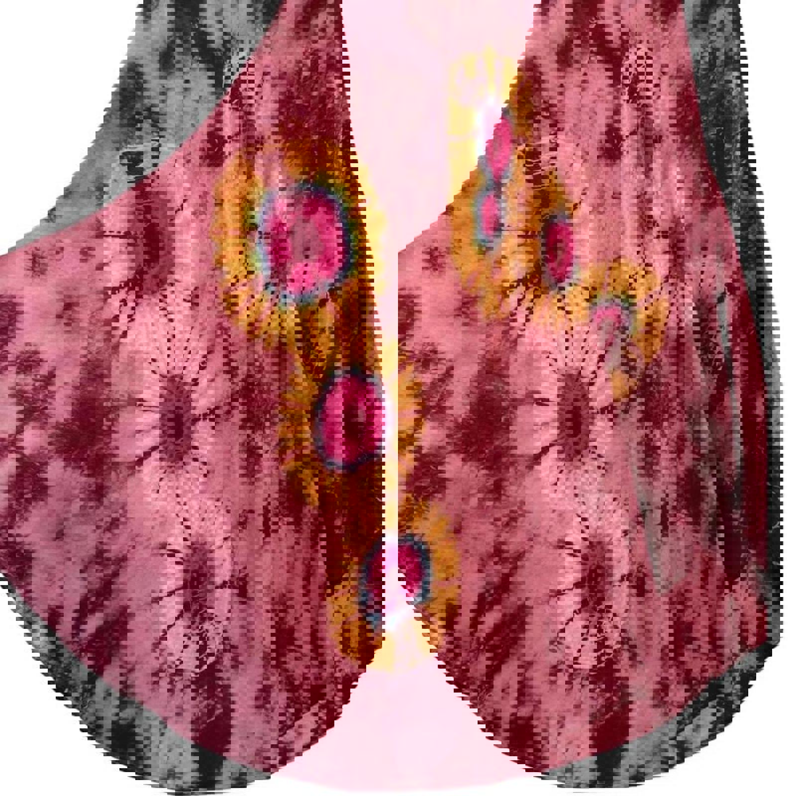 Flowy boho trapeze dress with a vibrant hand-dyed look. Features a maroon base with rainbow sunburst tie-dye designs, sleeveless cut, and a loose, swingy fit. Perfect as a festival dress, beach cover-up, or casual bohemian statement piece.
