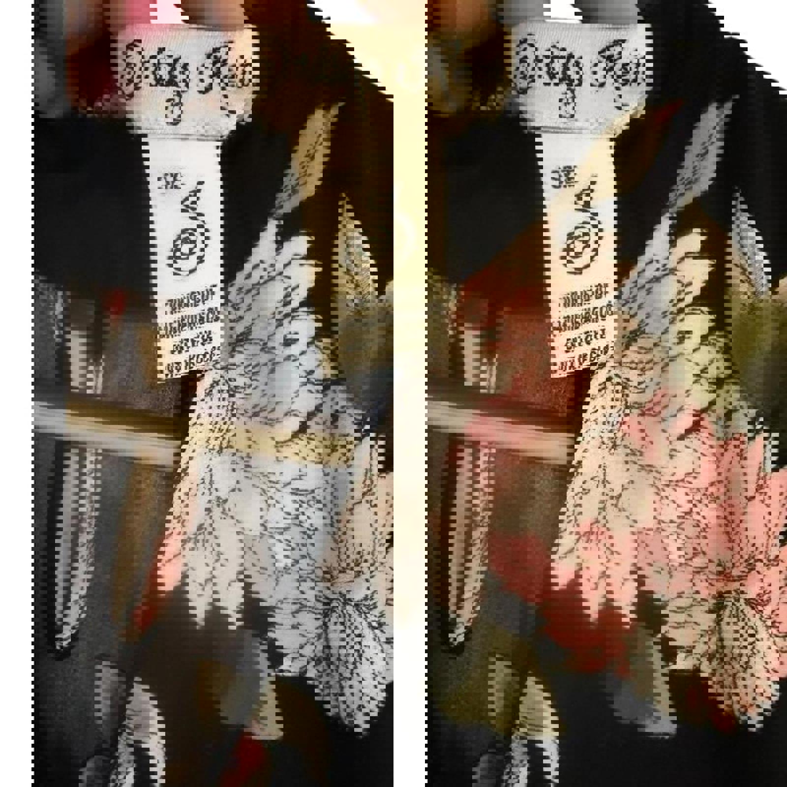 Lightweight black floral blouse with a soft drape and feminine details. Features a mock neckline with button-back keyhole, twist-front hem, and flared sleeves. A classic 2010s juniors’ style with boho-inspired charm.