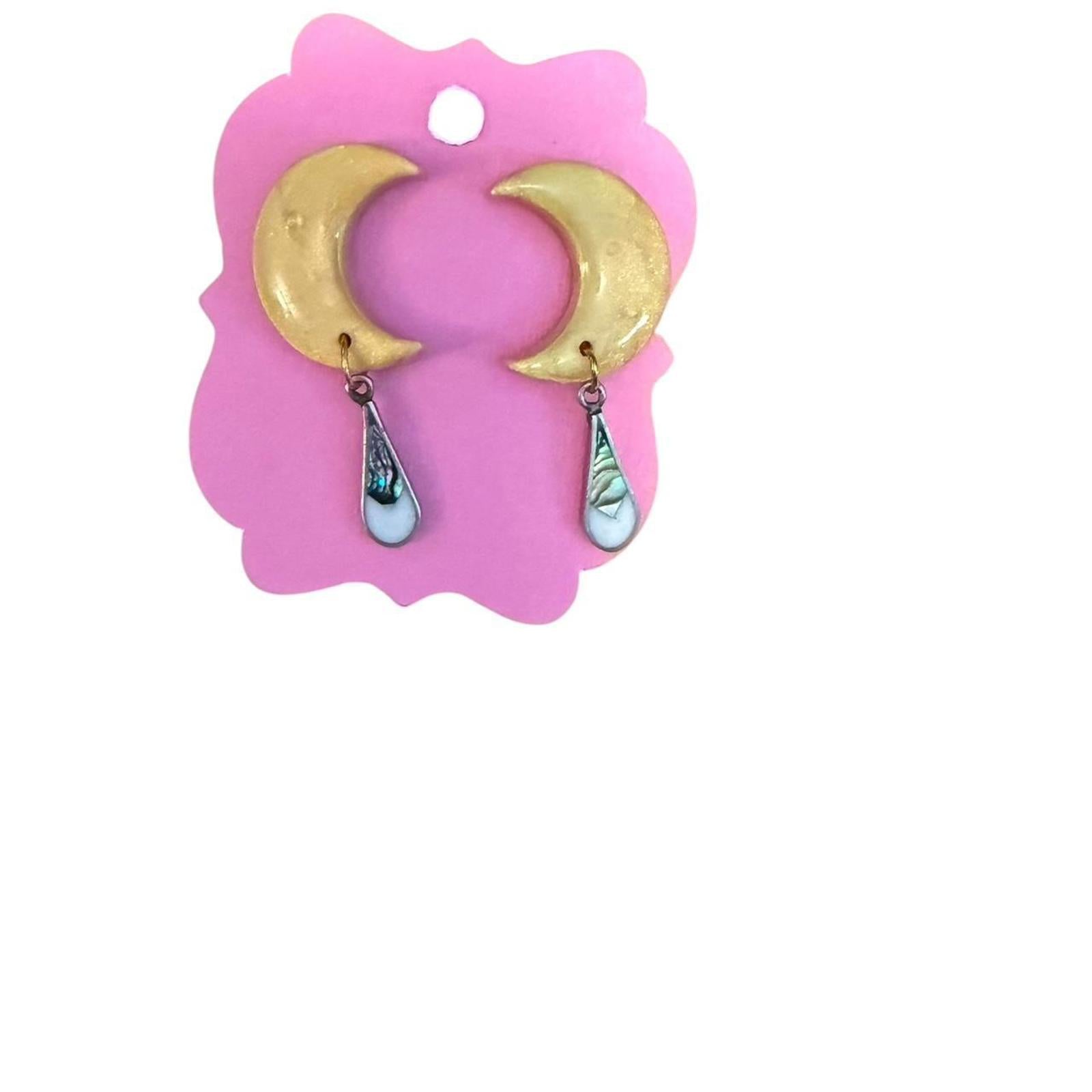 Handmade crescent moon earrings with a metallic gold finish, accented by abalone-style teardrop charms. Unique celestial-inspired design, lightweight and one-of-a-kind.