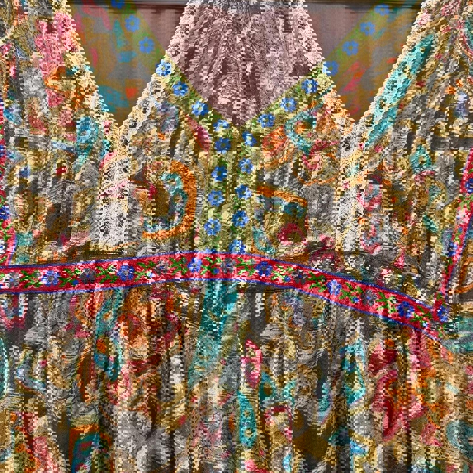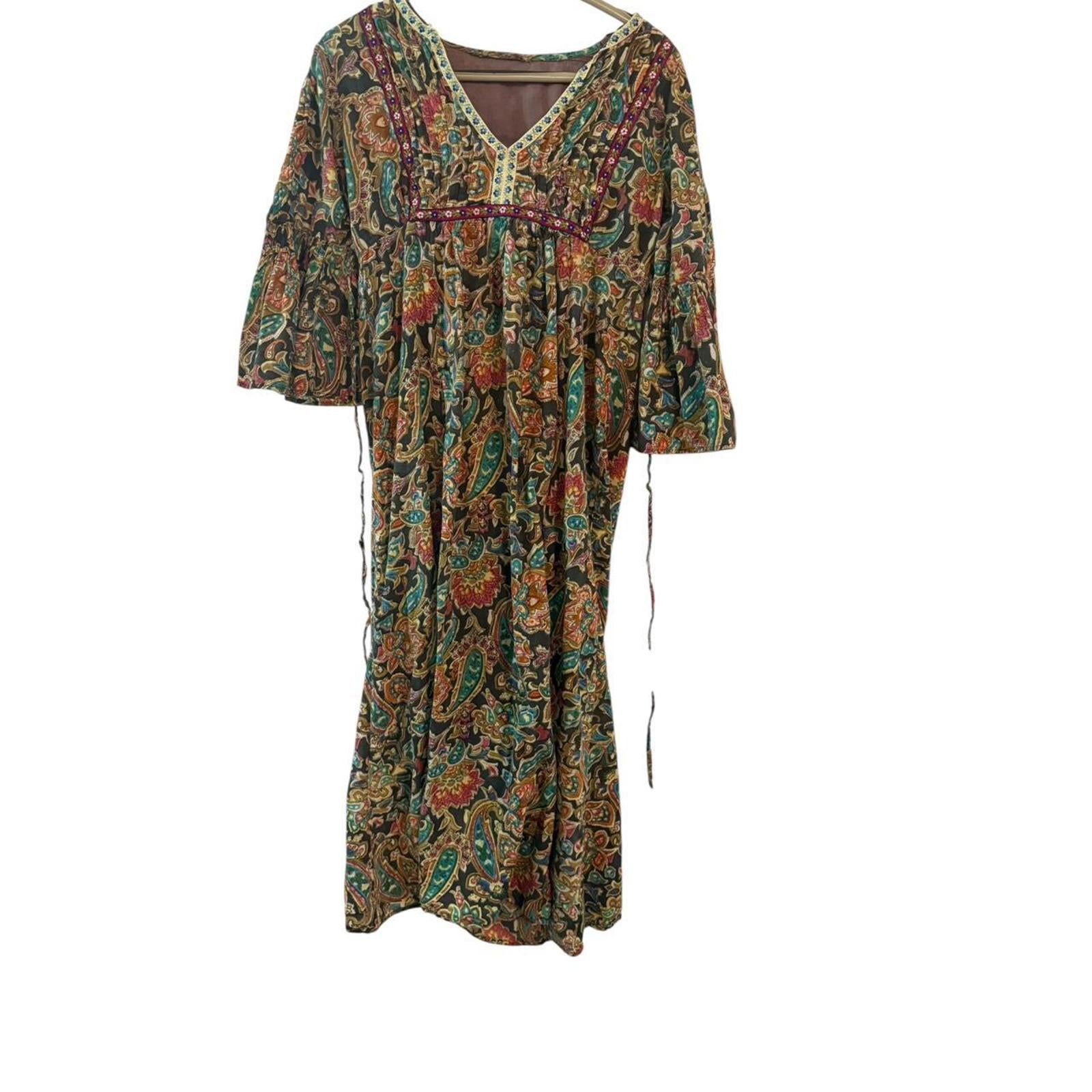 Authentic 70s bohemian hippie dress featuring a colorful paisley floral print with embroidered ribbon trim. The empire waist and bell sleeves give it that true festival-ready, free-spirited look that defined the decade.